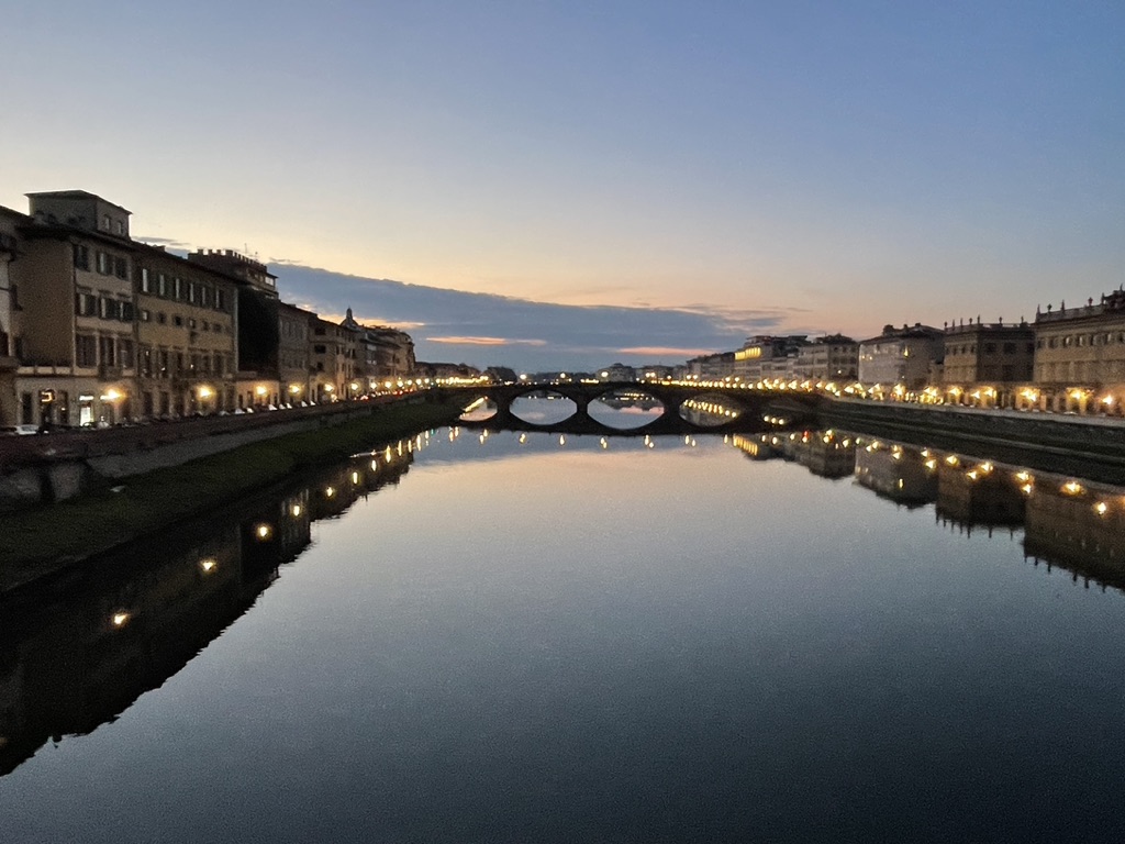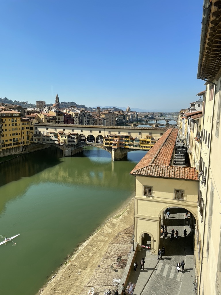 Our hotel, we learnt, was the oldest one in Florence, and, we were later to find, had not only a history dating back to the 13th century but a plumbing system to match. To our room on the almost top floor then, dump the bags, make an immediate cup of tea (because we are English and by 3 pm will suffer withdrawal symptoms if we don’t), and then out, out, down to the river, promenade along the bank, look at the cocktail options at the cafés and saying to each other that we could do that if we wanted to (because we could) but just carrying on walking anyway because there’s so much to see in a new city, and wandering around because around every corner, it would appear, is something to make you gasp. I envy anyone arriving in Florence for the first time because you do a lot of gasping. One minute you’re on the banks of the Arno, looking out at the bridges, all lit up by the sun behind you (gasp), then you turn around and see the Ponte Vecchio (gasp) with all the shuttered windows facing facing you and the second storey looking suitably precarious on top. The second storey was built for the Medici family (as was quite a bit of the city) so that Cosimo I could travel across the river without getting wet in the rain. He also decreed that the butcher shops, which he had dominated the bridge from the mid 15 century should be banned, because he objected to the smell. This ban is still enforced, which is the reason why it’s now dominated by jewellery shops, which are much easier on the nose and eye. Anyway, gasp.