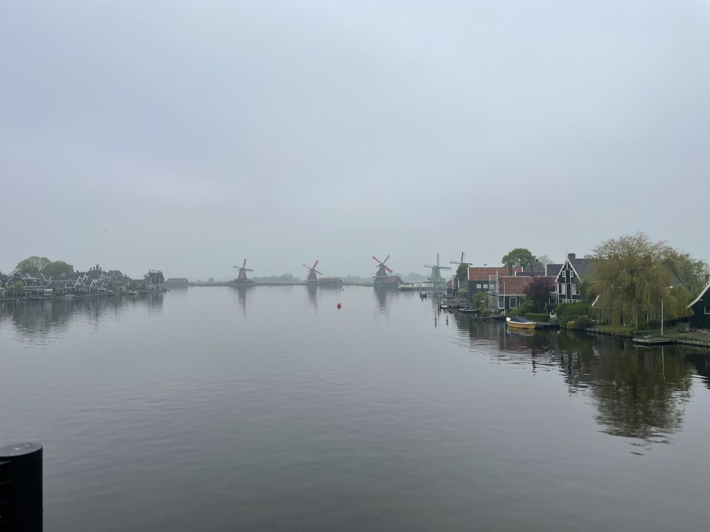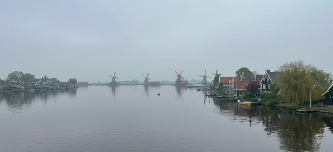 To bed then, and up for breakfast looking over the mist, to just about make out the windmills on the other side of the river: