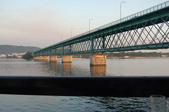 A word about the bridge. It’s called the Ponte Eiffel, (designed by yer man Gustav), it’s made of steel, it’s 645m long, and the top floor, where the traffic and pedestrians go, is completely open, except for a guard rail on each edge. I don’t know how high it is off the water, but definitely high enough that you don’t want to look down. There was no way that we were going to take a picture in that weather, so here’s one that someone took in drier times :