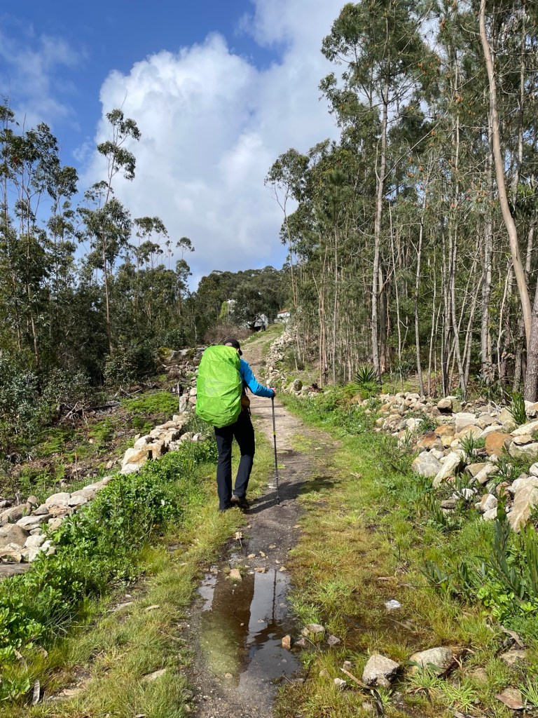 Day seven, and the first proper sunny day – our map suggested that we’d be hiking about 20km, but the caminho route said otherwise, and we ended up doing about 24km. A lot of this was off road, and a huge amount uphill, winding through forest tracks with terrific views of the ocean below, which for the first time showed a couple of spots that you might have been able to paddle in without being flattened by the big waves.
