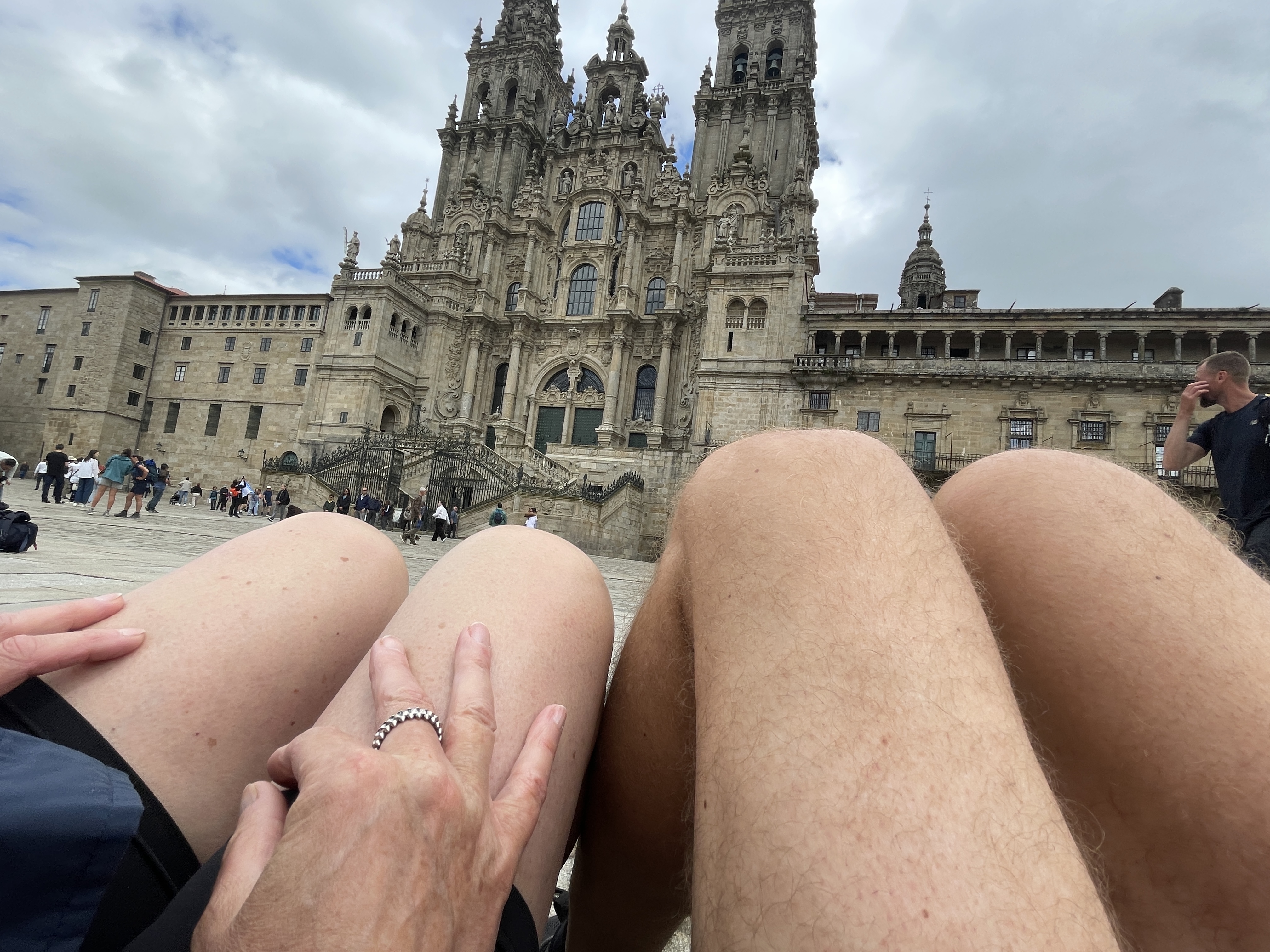 We were tucked up in bed a little later than ten and by the time we got to the 0730 breakfast, the locusts, or, as we will call them, mountain bikers, had already filled their capacious lycra clad stomachs and back pockets with pretty much everything that the buffet had to offer. Consequently we left for the longest leg with fairly empty stomachs, reminding ourselves that breakfast is a much overrated meal anyway. But this did mean that we managed a reasonably early start, and it was overcast until about 2pm, so perfect weather for the parade into Santiago at around 3. By the time we got to the outskirts of the city, we didn’t need signs any more, we just followed the snaking trail of pilgrims all the way to the cathedral, where we did all the things that you’re supposed to do at this point – sighed a bit, took pictures, posed for more pictures, sent messages home, took our shoes off, and lay in the sun with our heads facing up to the top of the cathedral.