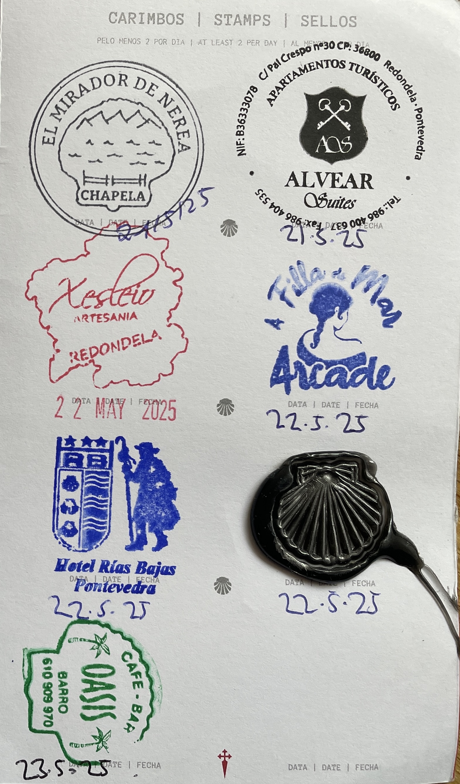 Pontevedra to Caldas de Reis next, and another six hours, very hot walking, but with a gentle breeze. And the mildest camembert, tee hee.* There was a big bump in the middle of the route, where we stopped at a very strategically placed van, serving food and drink. I mentioned in the first blog about getting your Compostela card stamped en route, which would mean that you would get a certificate at the end, and Mrs E was delighted to get by far the most elaborate stamp yet, finished in black wax with silver detailing. Also explained the length of the queue at the van.