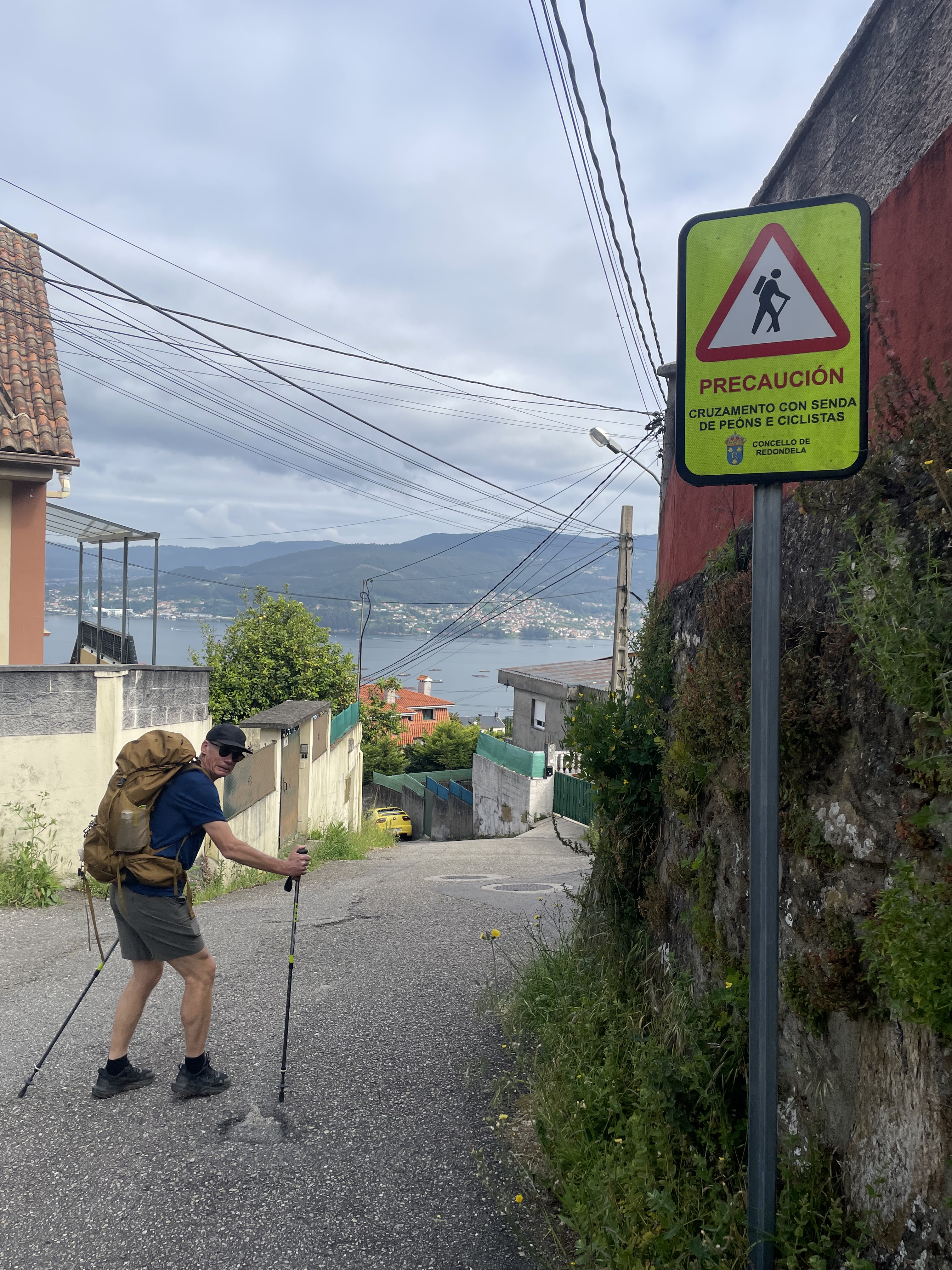 Redondela to Pontevedra the next day was a bit further, and took around six hours, with a couple of fairly gnarly climbs in the sun, but eased by some really great tracks in the forests, sometimes allowing us to look left and down to the inland sea of Enseada de San Simon. All a bit too much for Mrs E, who was missing cold water even more than spiritual awakening.